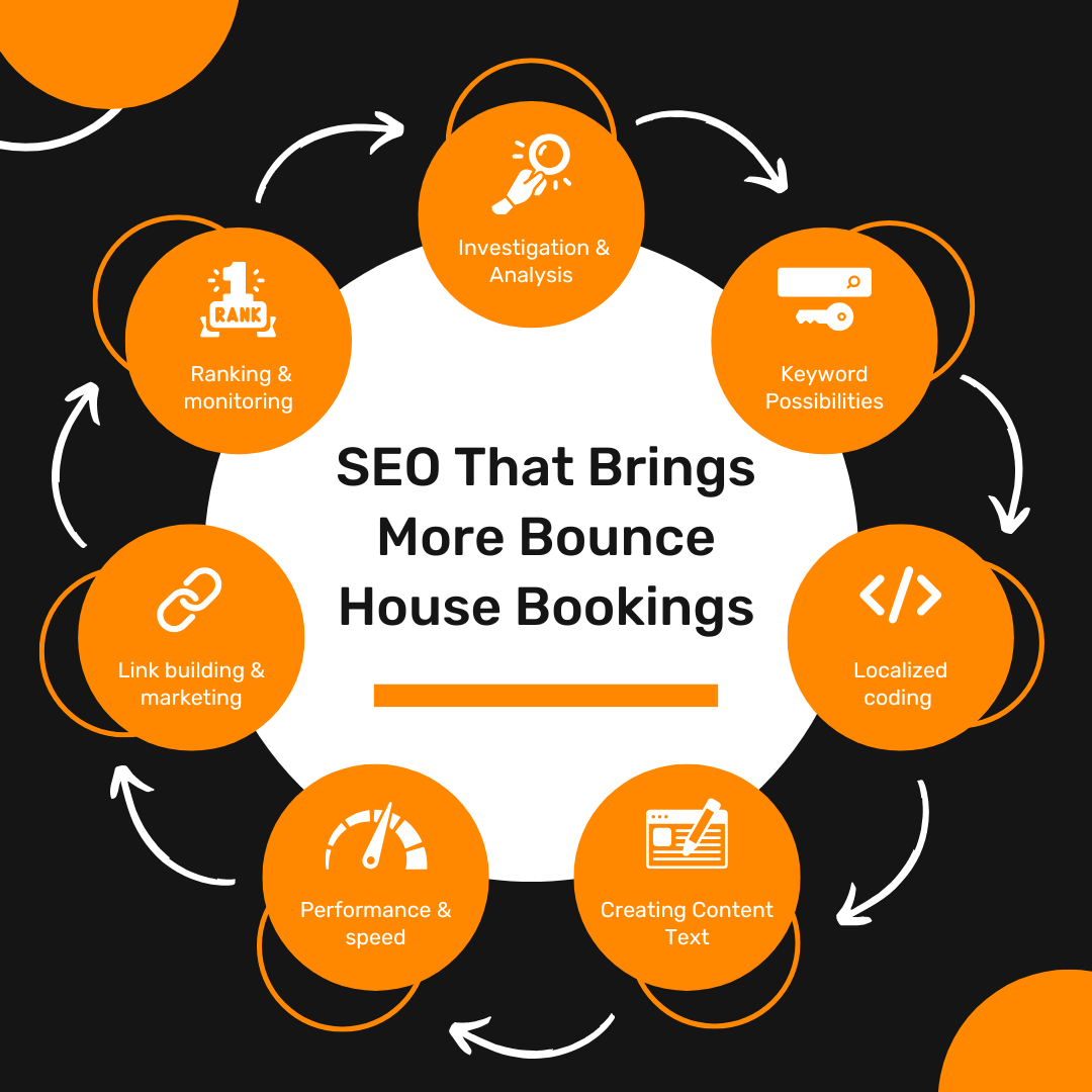 SEO increases your online visibility, helping parents and event planners find your bounce house business quickly. Higher rankings mean more clicks, more traffic, and more rental bookings consistently.